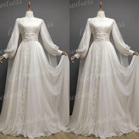 Chiffon Wedding Dresses High Neck Long Sleeves Muslim Buttons Lace