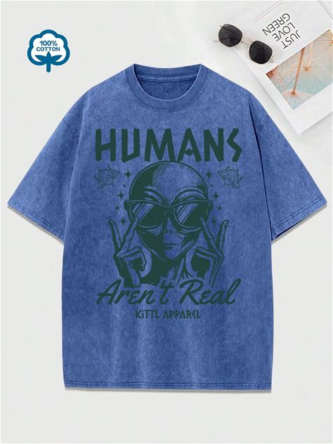 Women's Retro Style Alien Glasses Pattern T-Shirt - "Humans Are Not Real" Fun Astronaut Design, Short Sleeve, Summer Casual Top, Green Distressed Finish, Casual Clothing, Perfect Gift For Sci-Fi Fans, Medium Stretch Fabric,L